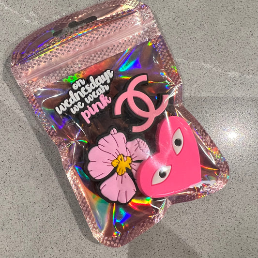 Croc charm set 4pk - Chanel ya know! - Play heart, flower, pink wed.